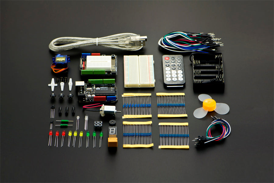 A DFRduino UNO R3 (Compatible with Arduino Uno), the most stable and commonly used Arduino processor, together with DFRobot's best-selling prototype shield are included in this kit.