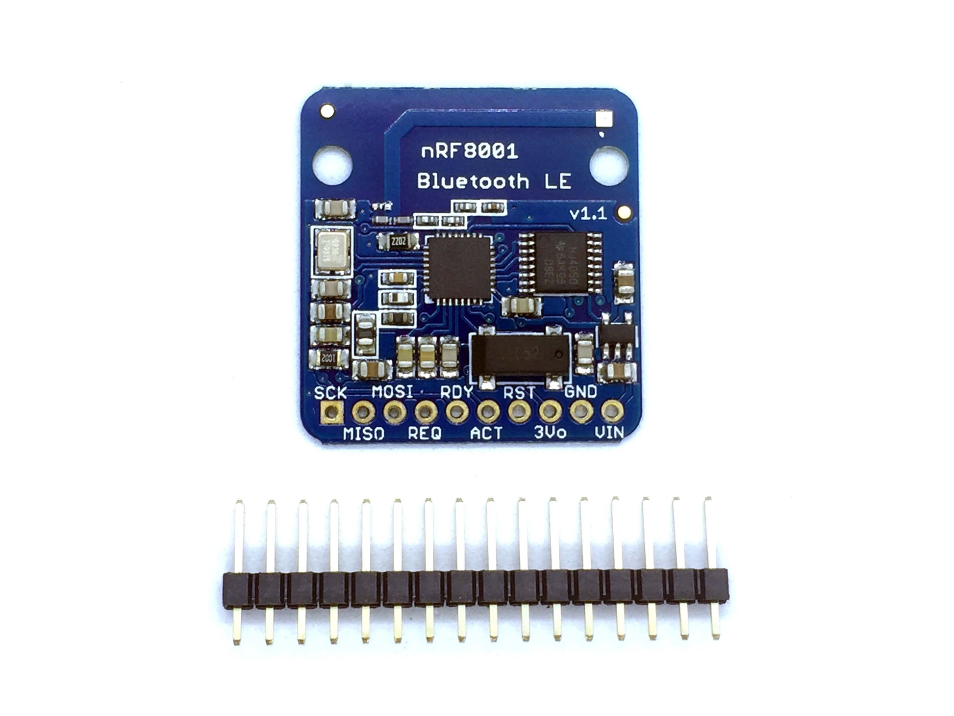 Bluefruit LE Bluetooth Low Energy BLE 4.0 nRF8001 Breakout - Our Adafruit Bluefruit LE (Bluetooth Smart, Bluetooth Low Energy, Bluetooth 4.0) nRF8001 Breakout allows you to establish an easy to use wireless link between your Arduino and any compatible iOS or Android (4.3+) device. It works by simulating a UART device beneath the surface, sending ASCII data back and forth between the devices, letting you decide what data to send and what to do with it on either end of the connection.