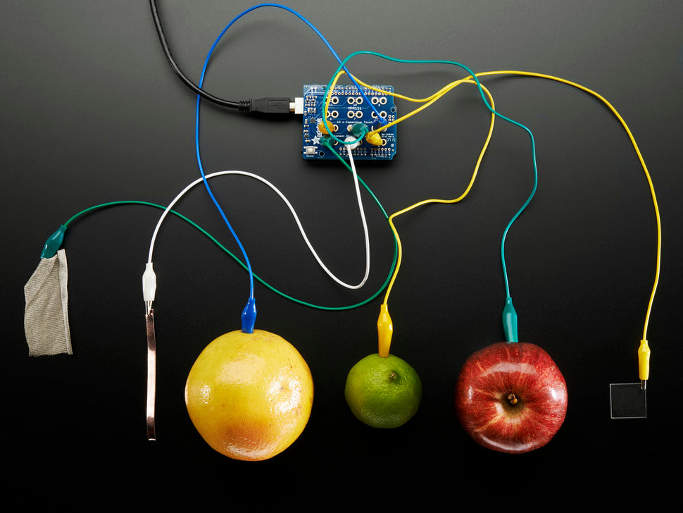 It uses the same chip as our MPR121 12-Key Capacitive Touch Sensor Breakout so you can duplicate the library and code! We have examples for reading touches. Using an Arduino Leonardo and a little bit of creativity you can use it to turn touches into keyboard KeyUp/KeyDown presses (so you can make a veggie-keyboard) or pair it with our Music Maker shield to create an audio player that will play a sound per sensor (fruit drums!)