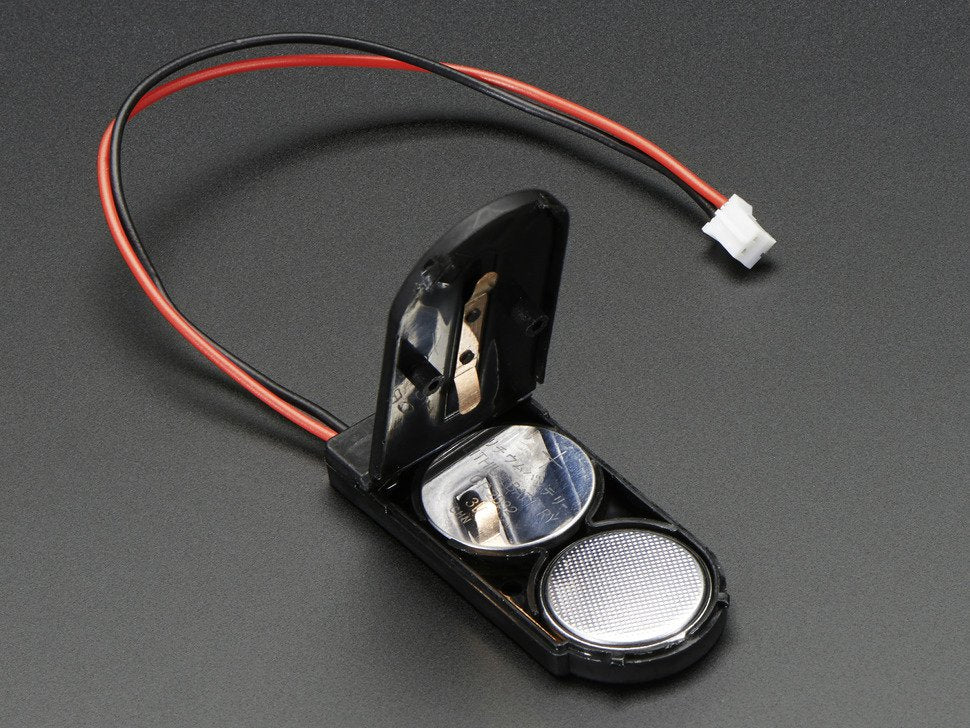 This tiny coin cell battery holder is ideal for small portable or wearable projects. It holds two 20mm coin cells (2032 are the most popular size) in series to generate 6V nominal. (If you want only 3V, we suggest sticking a crumpled piece of tin foil in one of the slots.) 20mm coin cells are popular as they are used in keychain lights, so they are easy to get, and fairly low cost. They tend to have about 220mAh capacity so this holder would give you 6V @ 220mAh with two cells.