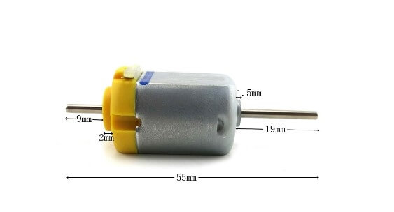 A 130 DC Motor is the go-to motor for small and DIY project. You can create cars, robot and power generator with it. This motor has a extended shaft to meet those purpose. End-to-end it is about 55mm long.