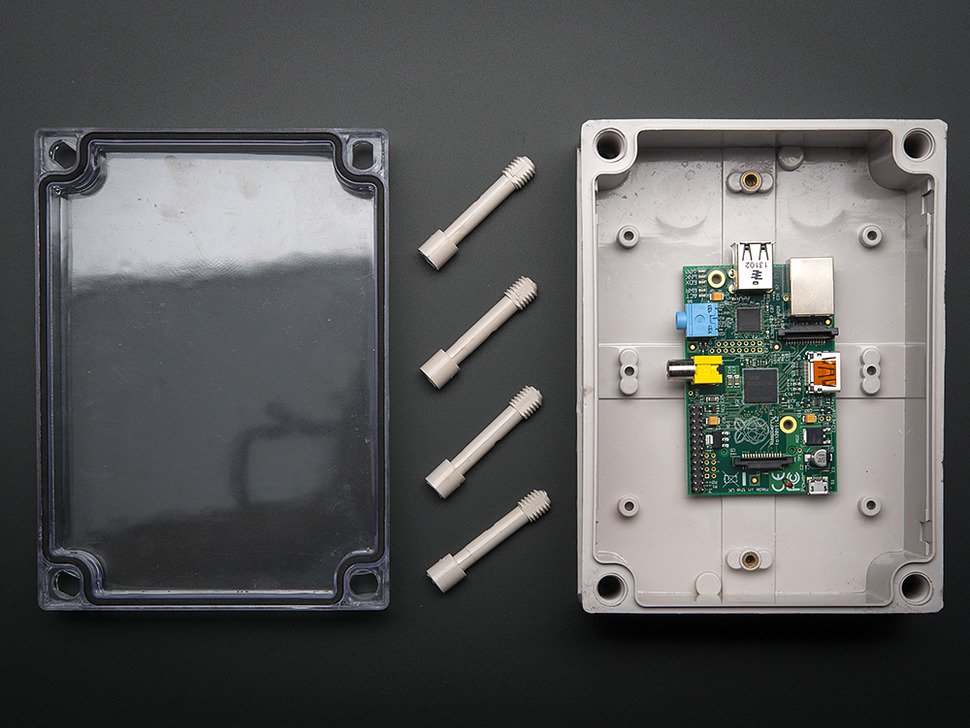Store your project safe and sound in this nice weatherproof box with a clear top. We picked up this box because we like the machinable ABS plastic body and tough clear polycarbonate cover, the built in weatherproof gasket seal, and the easy-open screws that can be taken apart as many times as you wish without worrying about cracking or stripping.