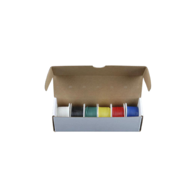 Multiple colored wires; red, blue, yellow, green, black and white. Packed for easy use and storage. The size is 22 AWG and each spool is around 25 feet.
