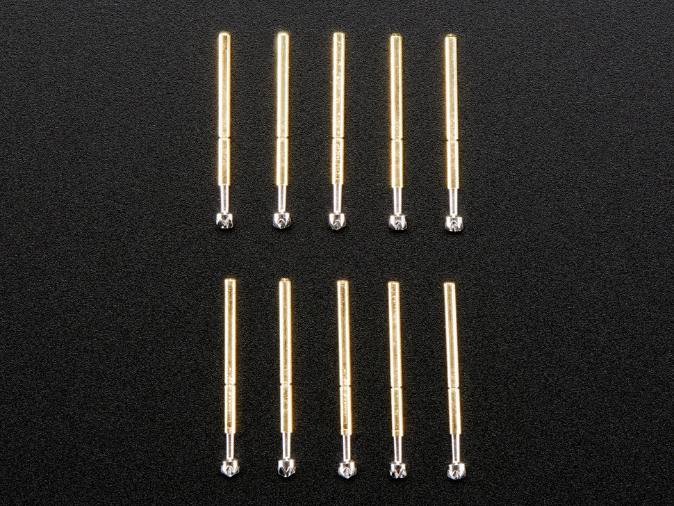 Pogo pins are little spring-loaded contacts, very handy for making jigs, or making momentary (but electrically solid) contacts. We use them by the dozen for making programming and testing jigs but they're handy also if say you want to JTAG program a board that you cant solder headers to - just shove these thin contacts into a 0.1" pitch IDC programming cable and press it onto the contacts.