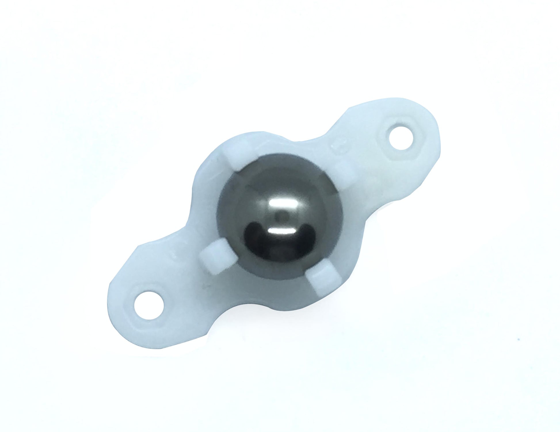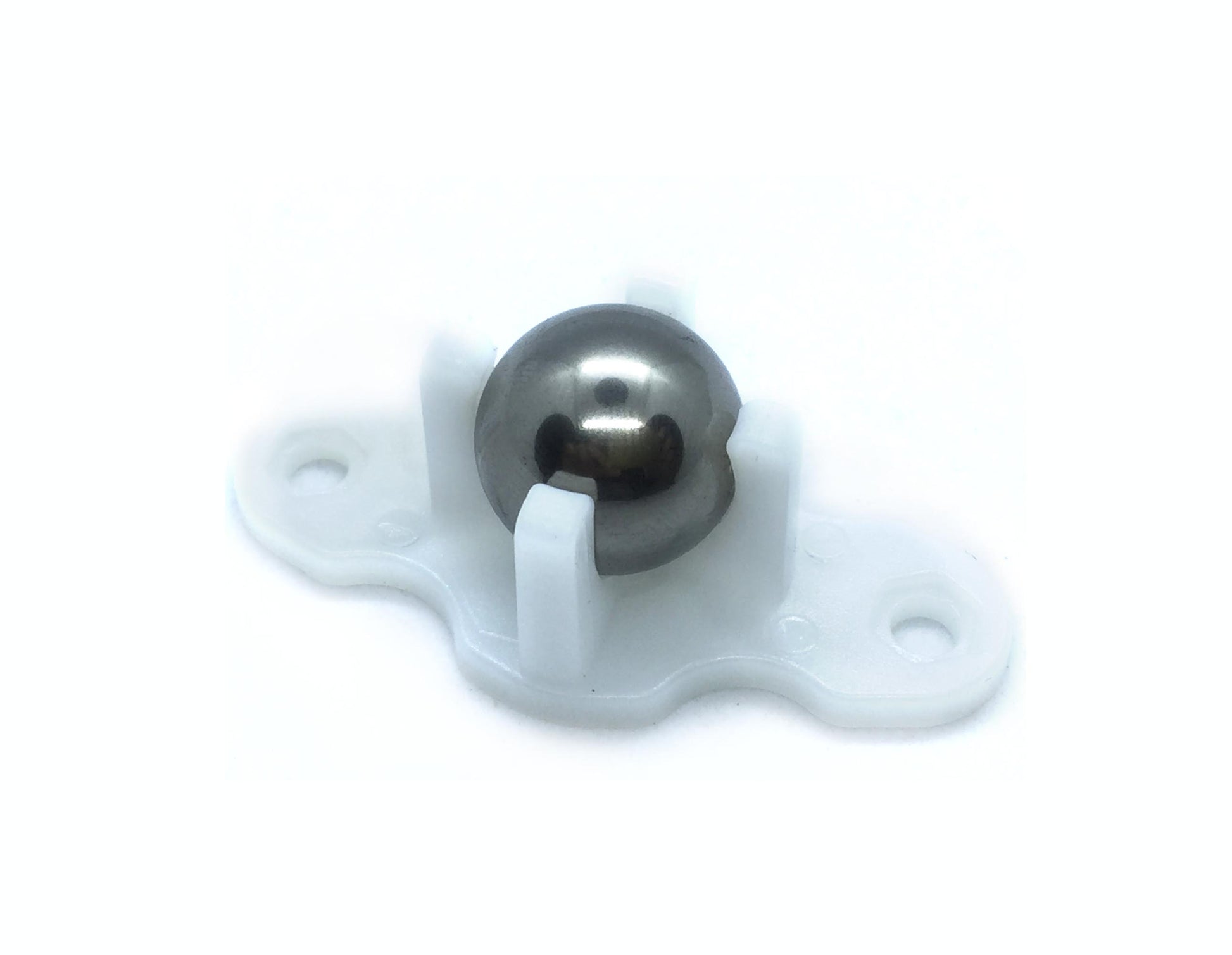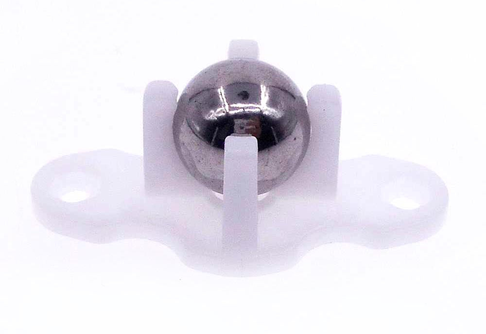 This caster ball is a spherical metal ball that mounts in a restraining fixture. It has a height of 20mm and a mounting hole with a distance of 40mm from each other.