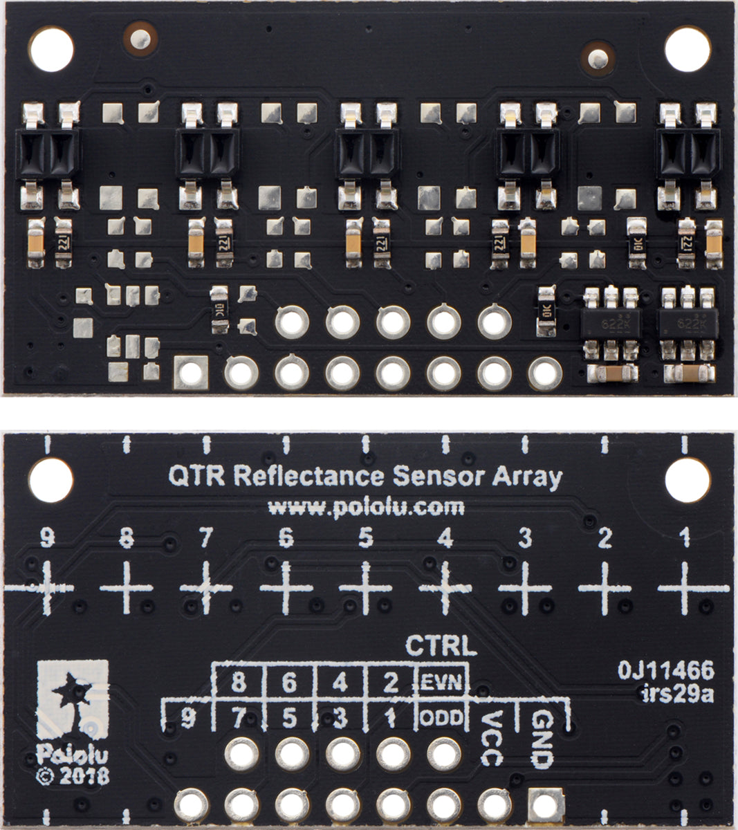 This array of IR LED/phototransistor pairs is great for precisely identifying changes in reflectance (like line detection). It operates from 2.9 V to 5.5 V and offers dimmable brightness control independent of the supply voltage. In general, the closer the object, the higher the contrast between light and dark readings, but high-reflectance objects are generally detectable out to around 40 mm. This version features the traditional-style QTR sensors without lenses.