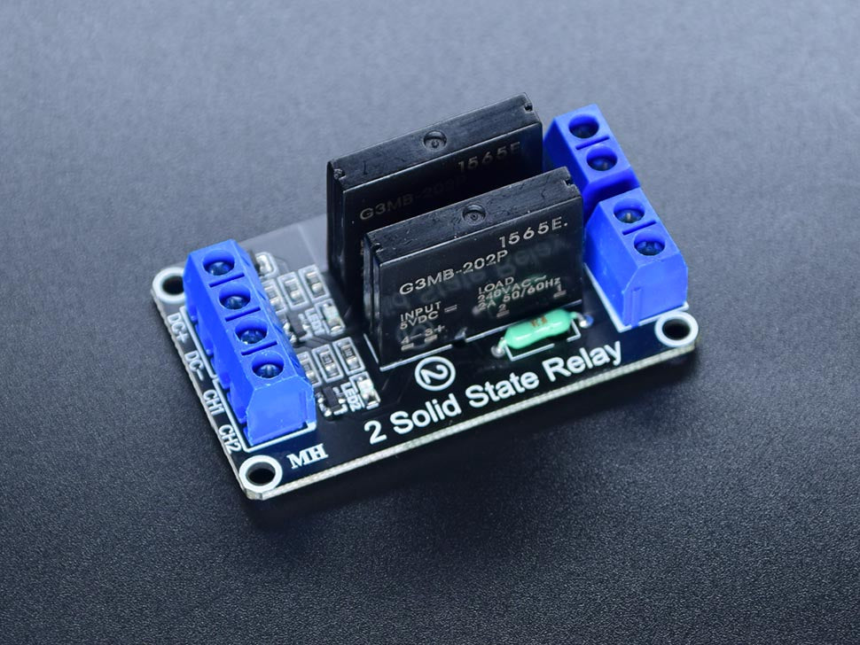 This solid-state relay module has two channels, which controlled separately. It uses Omron G3MB, to control current up to 2A @ 240VAC.