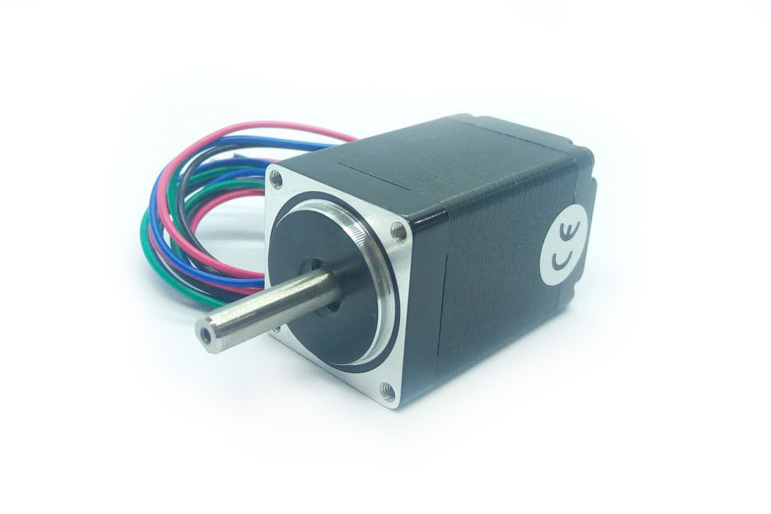 This small hybrid bipolar stepping motor has a 1.8° step angle (200 steps/revolution). Each phase draws 600 mA at 3.9 V, allowing for a holding torque of 180 g-cm (2.5 oz-in). The motor has four color-coded wires terminated with bare leads: black and green connect to one coil; red and blue connect to the other. It can be controlled by a pair of suitable H-bridges (one for each coil), but we recommend using a bipolar stepper motor driver.