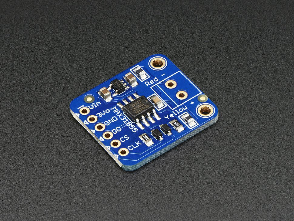 Thermocouple Amplifier MAX6675 breakout board. Thermocouples are very sensitive, requiring a good amplifier with a cold-compensation reference. The MAX6675 does everything for you and can be easily interfaced with any microcontroller, even one without an analog input. This breakout board has the chip itself, a 3.3V regulator with 10uF bypass capacitors, and level shifting circuitry, all assembled and tested. Comes with a 2 pin terminal block (for connecting to the thermocouple) and pin header (to plug into any breadboard or perfboard). Goes great with our 1m K-type thermocouple.