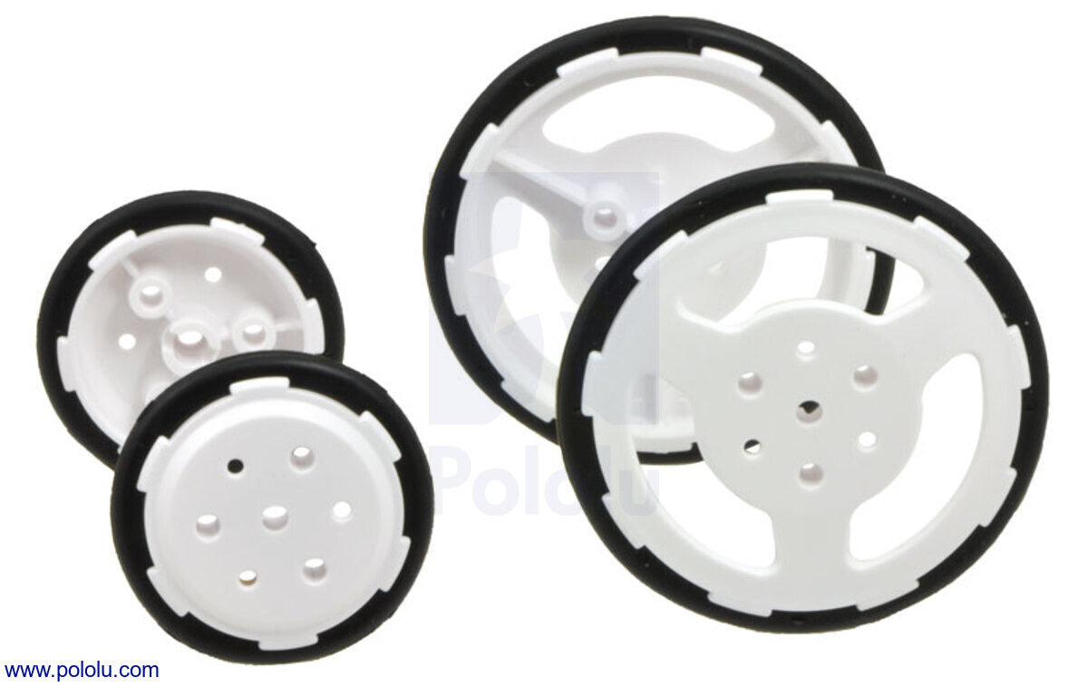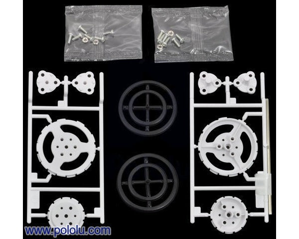 - Four wheels (two for each tire size) compatible with round 4 mm shafts such as the ones on the Tamiya high-speed gearbox kit