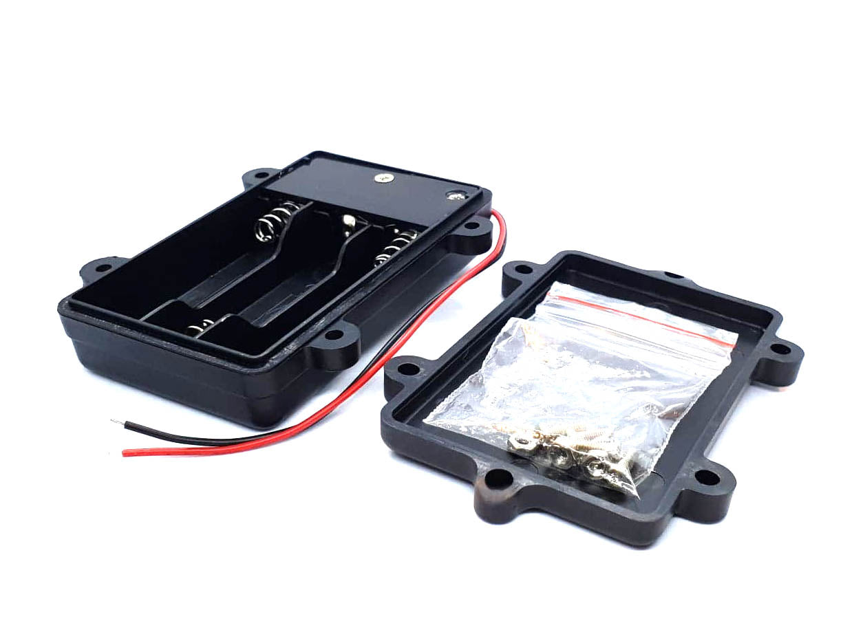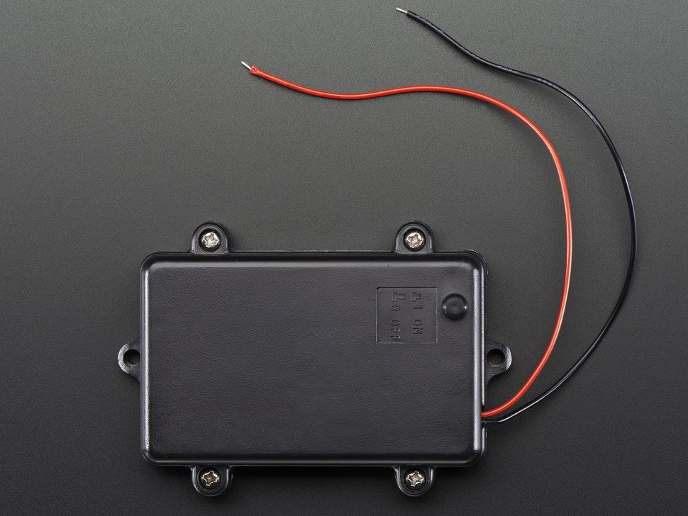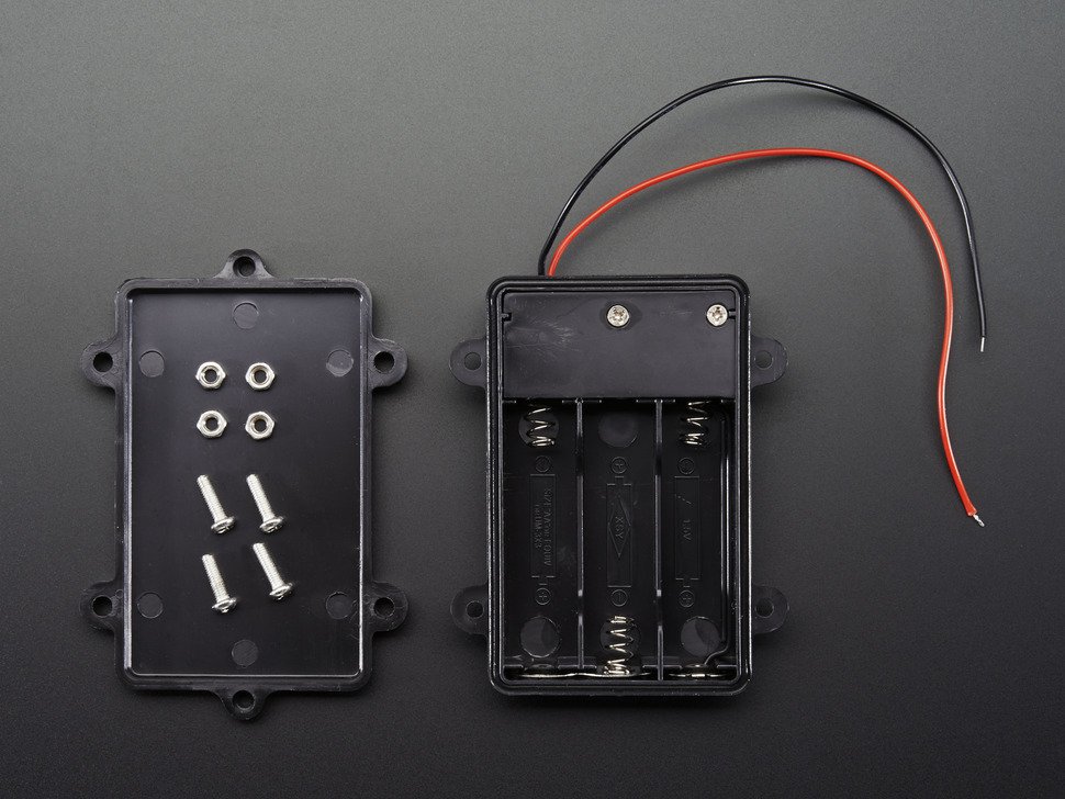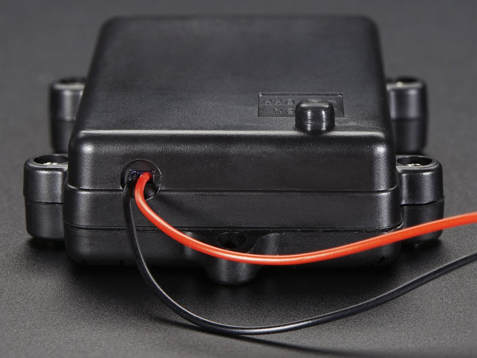 Keep your power source safe and toasty in these waterproof 3xAA battery holders. They're just like classic switched battery holders, but designed for survival! The case has a rubber gasket around the edge of the case (its black and hard to see in the photos but it is there) and attaches together with 4 machine screws. What we like about this design is that the hexnuts are captive in one side and you can assemble/disassemble as many times as you need. There's a potted power switch and a rubber-boot on-off switch (press to turn on/off). Use with any alkaline or rechargeable batteries for about 4.5V output.
