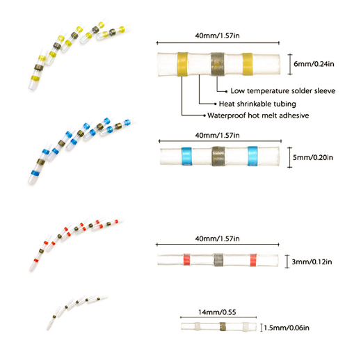 This kit offers versatility with multiple color-coded sizes: 10 white pieces, 23 red pieces, 12 blue pieces, and 5 yellow pieces, covering wire gauges from 22-16 AWG. The tubes are easy to use, simply heat them to activate the shrinkage, creating a firm bond that protects against moisture and corrosion. The tin-plated copper ring inside the tube ensures excellent conductivity, making it perfect for a wide range of electrical applications, including automotive, marine, and household wiring.