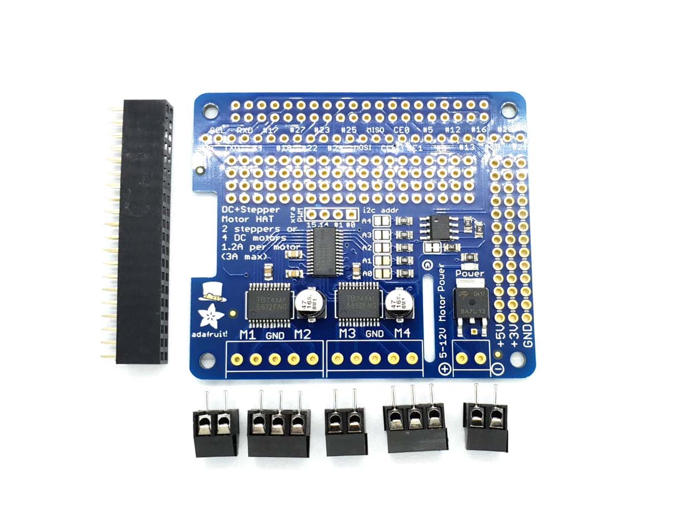 Raspberry Pi DC Stepper Motor HAT Mini Kit Adafruit Let your robotic dreams come true with the new DC+Stepper Motor HAT from Adafruit. This Raspberry Pi add-on is perfect for any motion project as it can drive up to 4 DC or 2 Stepper motors with full PWM speed control.