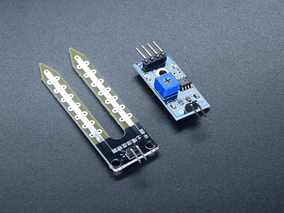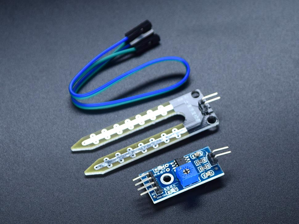 Soil Moisture Sensor Analog-Digital - This sensor allows you to detect the moisture of the soil, and/or check if the sensor is dry or not. This sensor only requires three pins (D0, VCC, GND). You may adjust its sensitivity using rotating the in-board potentiometer.