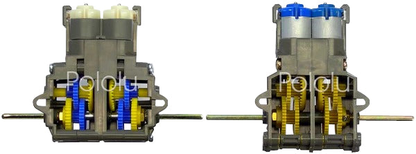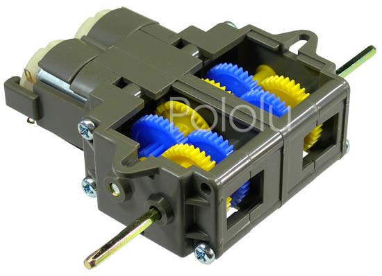 The Tamiya double gearbox is a compact unit with two independent motors and gear trains. The kit includes two motors and all gears and parts to build any of the four possible gear ratio configurations (12.7:1, 38:1, 115:1, and 344:1). Although it is not typical, it is possible to assemble each side with different gear ratios. There are two possible output axle locations (for any given gear ratio, only one output location is possible).