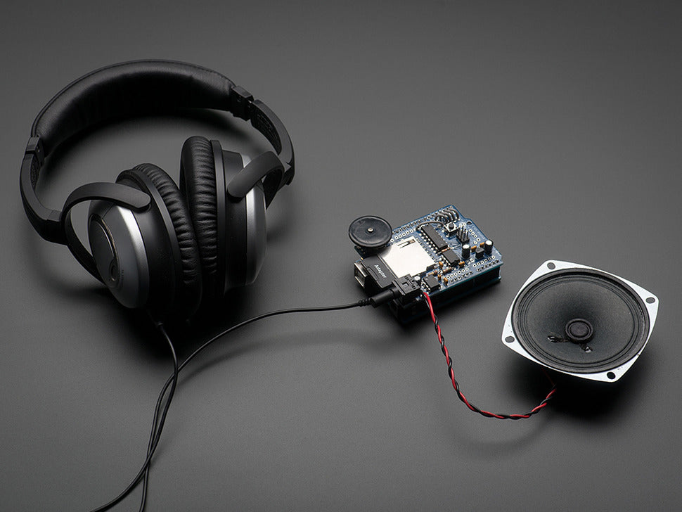 The shield comes with an Arduino library for easy use; simply drag uncompressed wave files onto the SD card and plug it in. Then use the library to play audio when buttons are pressed, or when a sensor goes off, or when serial data is received, etc. Audio is played asynchronously as an interrupt, so the Arduino can perform tasks while the audio is playing.